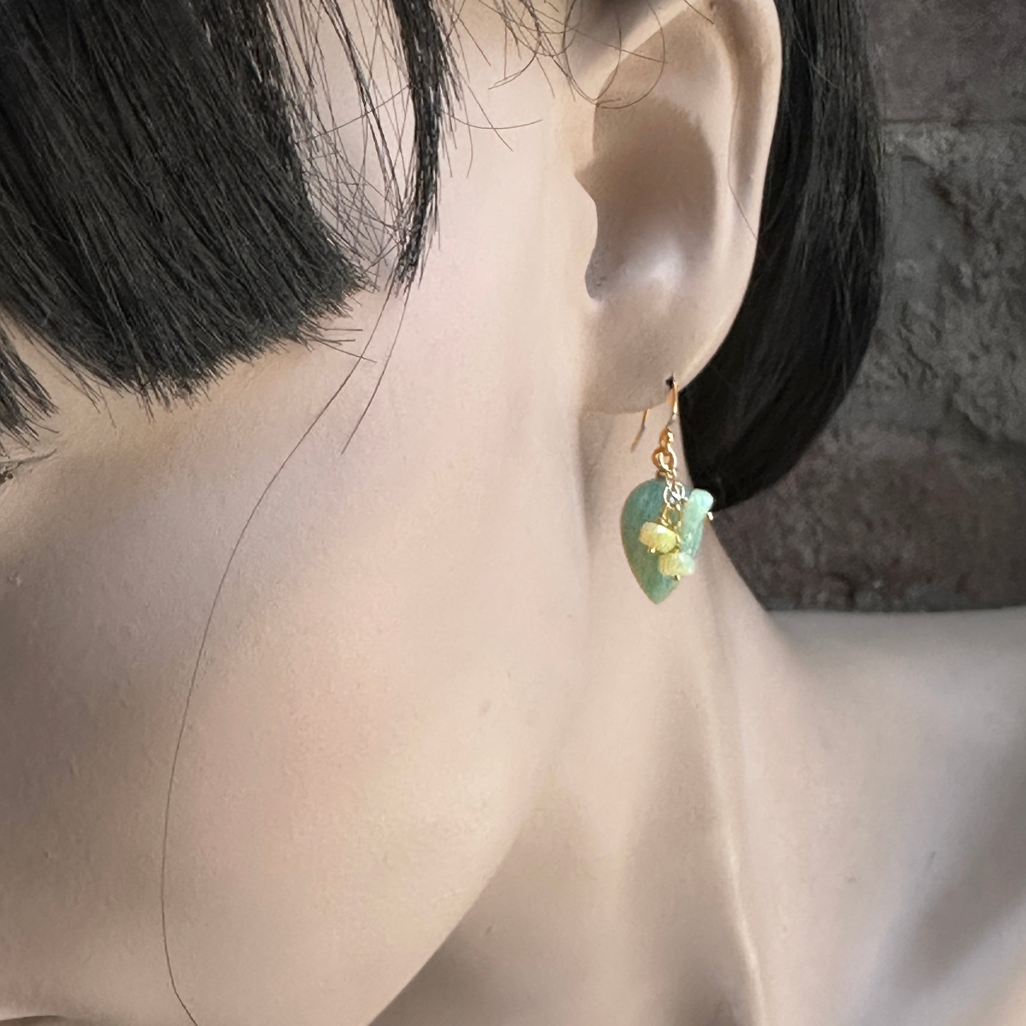 These earrings showcase Amazonite drops, 16x10mm each, with Ethiopian iridescent opals in an elegant path along the design. The soft, soothing blue-green tones of the Amazonite are beautifully complemented by the play of light dancing across the opals, creating a mesmerizing interplay of color and luminosity. Set in lustrous gold, this refined piece combines natural gemstone beauty with timeless elegance, making it an ideal choice for those who appreciate understated sophistication and distinctive artisanal craftsmanship.