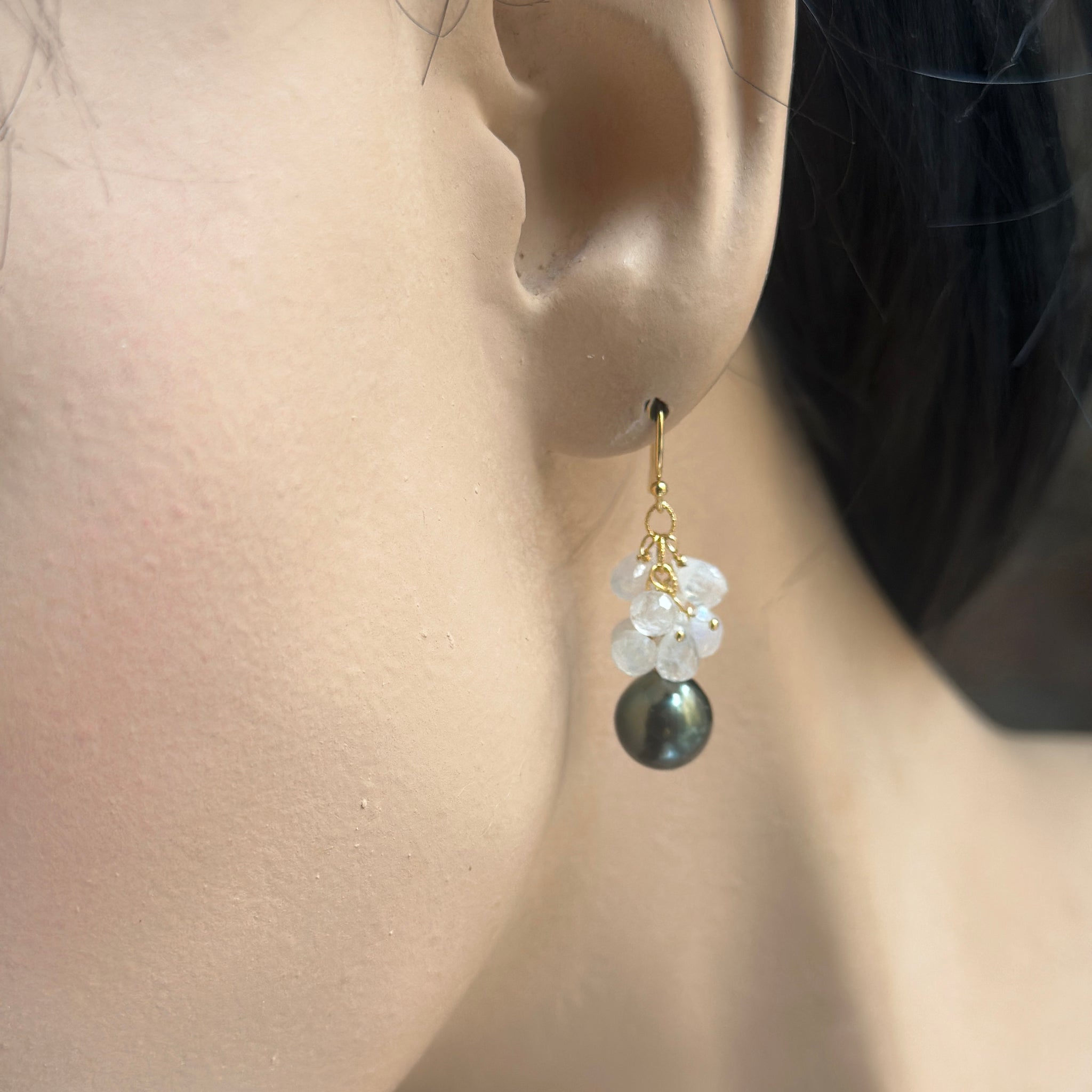 These elegant earrings combine the lustrous depth of a Black Tahitian Pearl with the gentle iridescence of micro-faceted Rainbow Moonstone briolettes. The understated design works seamlessly for everyday wear or special occasions, offering just enough shimmer to catch the light without overwhelming your look. A timeless piece that brings quiet sophistication to any ensemble.