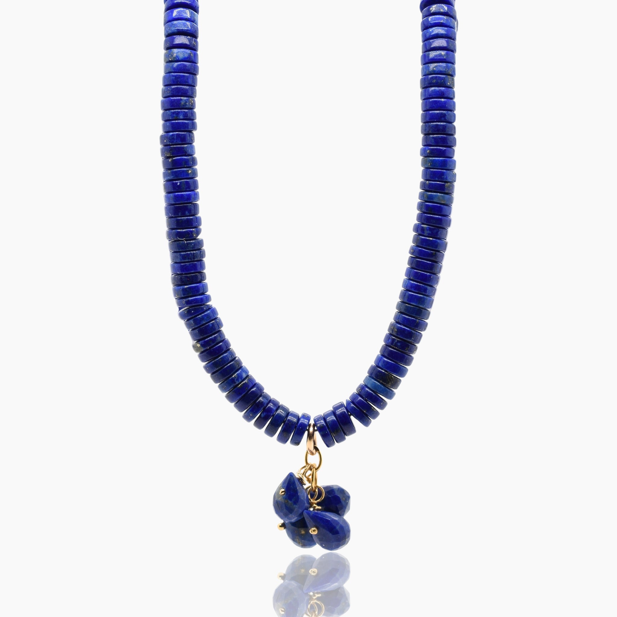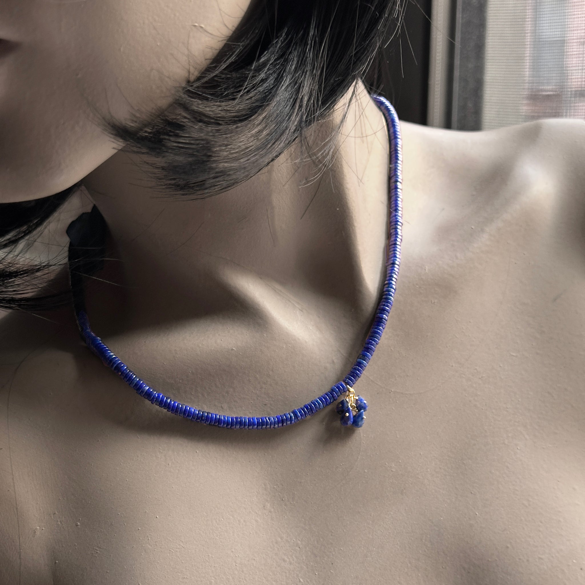 The Lapis Discs and Cluster Gold Necklace offers understated elegance through its thoughtful design. Smooth lapis lazuli discs create a quiet foundation, complemented by a delicate briolette cluster that adds subtle dimension without overwhelming the eye. The deep blue stone, naturally marked with pyrite, brings a timeless quality that works seamlessly with any wardrobe.