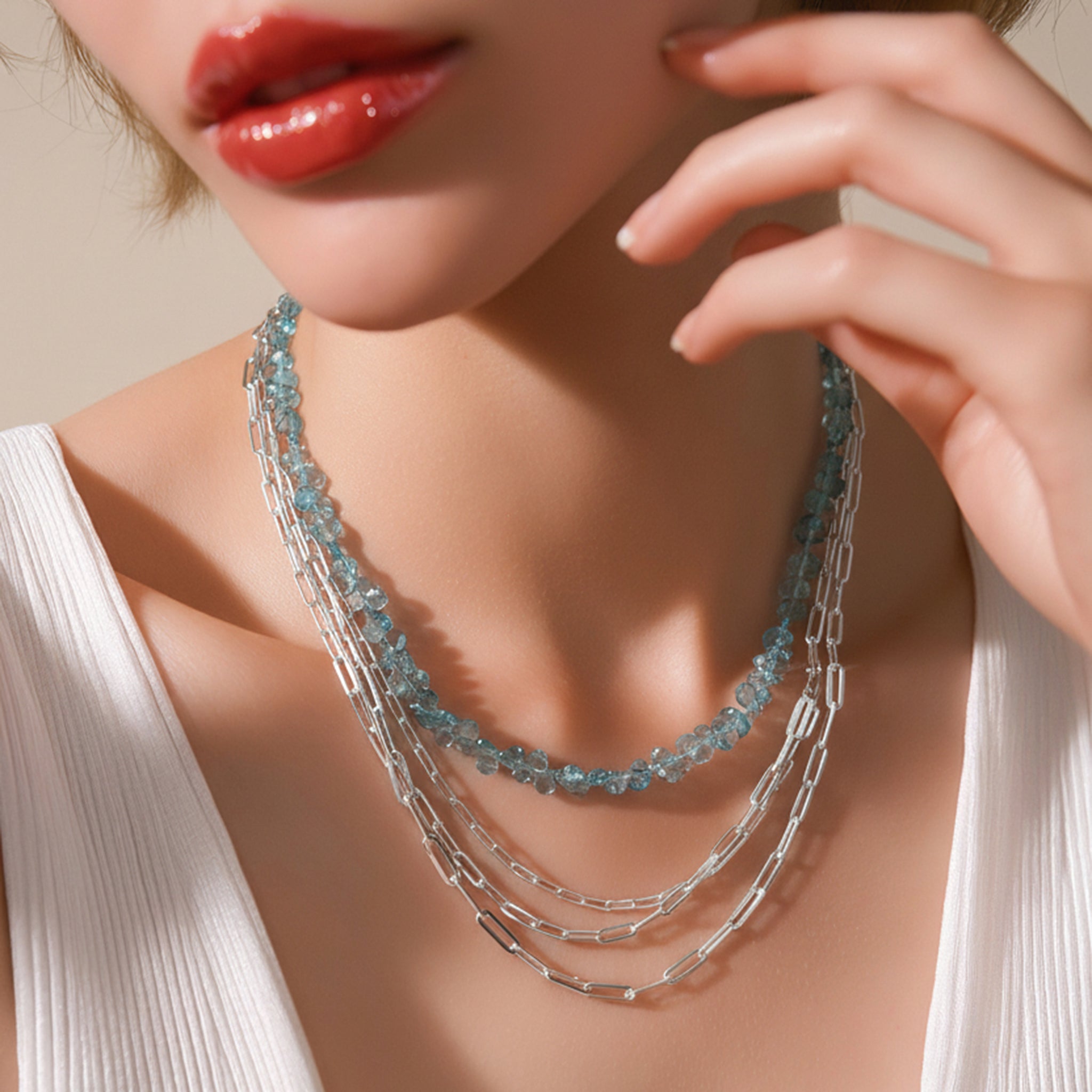Four strands of pure charm come together in this delightful necklace—three graceful paperclip sterling silver chains in graduated sizes meet a sparkling strand of Santa Maria aquamarine briolettes from Brazil. At 18 inches, it's the perfect length for layering or wearing solo, and a trusty spring ring clasp keeps everything secure. Limited in production, this playful piece brings a touch of whimsy and elegance to any jewelry collection.